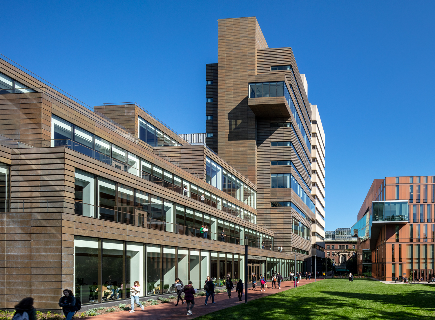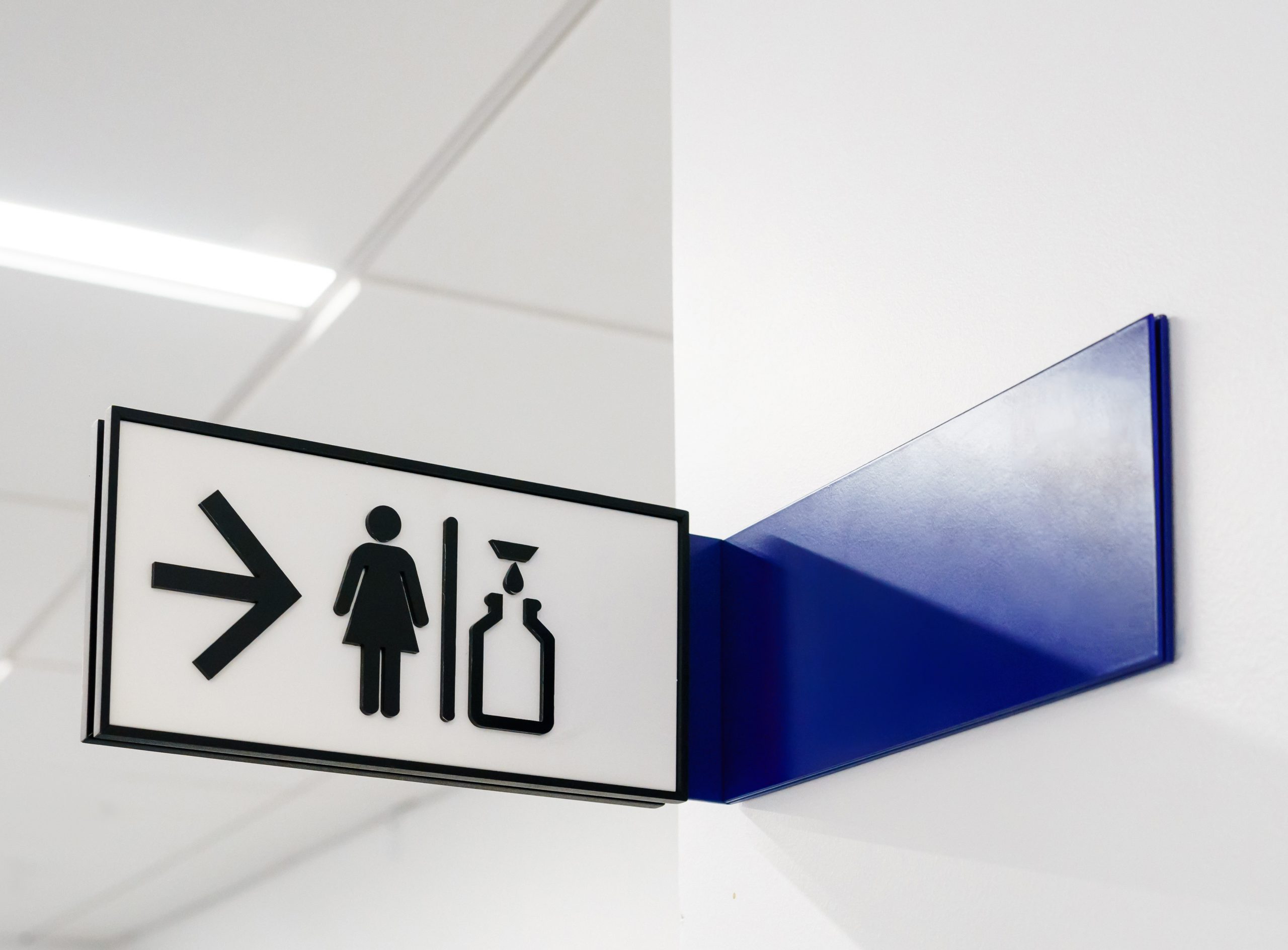 The concepts of fragmenting and framing are central to the wayfinding, identification, and donor signage designed for the new Cheryl and Philip Milstein Center for Teaching and Learning at Barnard College. The 128,000-square-foot Milstein Center is an addition to the campus the renowned women’s liberal arts college partnered with Columbia University. The framing concept can be found in the directional signage throughout the building, allowing for an easily changeable system of signs, with a style that reflects Barnard’s branding and straightforward academic attitude. The flexible black framed signs feature white interiors and Barnard blue, like a reflection of the quintessential Barnard student in black-framed eyeglasses, white shirt and blue jeans. Special attention was given to addressing gender: a non-gendered set of symbols are used for the building’s “gender inclusive” restrooms. The lobby of the Center, used for reception, study, and convocation, is foregrounded with a visually striking donor wall. The display is a flurry of panels of varying shapes, sizes and hues of blue that coalesce into the Barnard College seal, each panel thanking a particular donor who has helped make the building possible. The donor wall serves as an artwork, with thin panels posted off the wall in a single continuous plane to create an attractive organic whole.