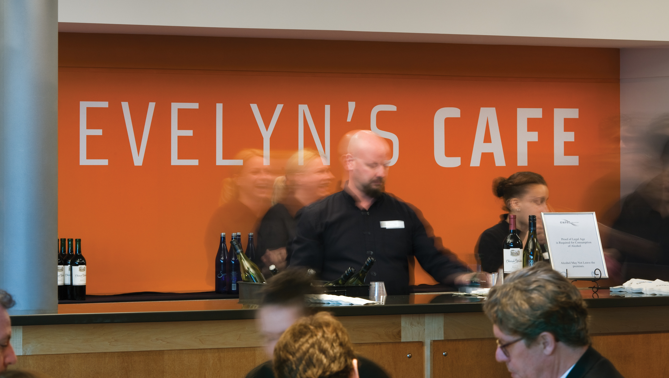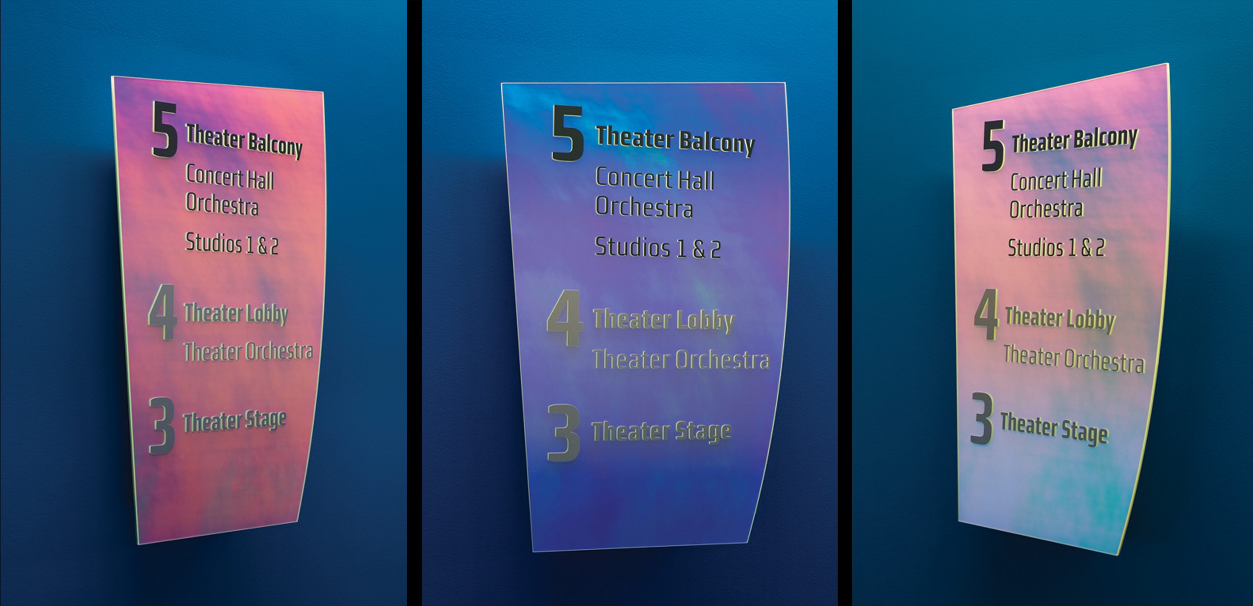 At Rensselaer Polytechnic Institute in Troy NY, the Curtis R. Priem Experimental Media and Performing Arts Center (EMPAC) is a $350 million facility housing experimental performance spaces, offices, artist-in-residence studios, a gallery, a cafe, and a radio station. The wayfinding program draws on three forces for inspiration. The unique shapes derive from principles of acoustic design, avoiding right angles and embracing curved lines; the reflective iridescent finishes, constantly changing color, are inspired by the sunset paintings of the Hudson River School; and the construction techniques correspond with the details of the architecture. Architects: Grimshaw, Davis Brody Bond Aedas.