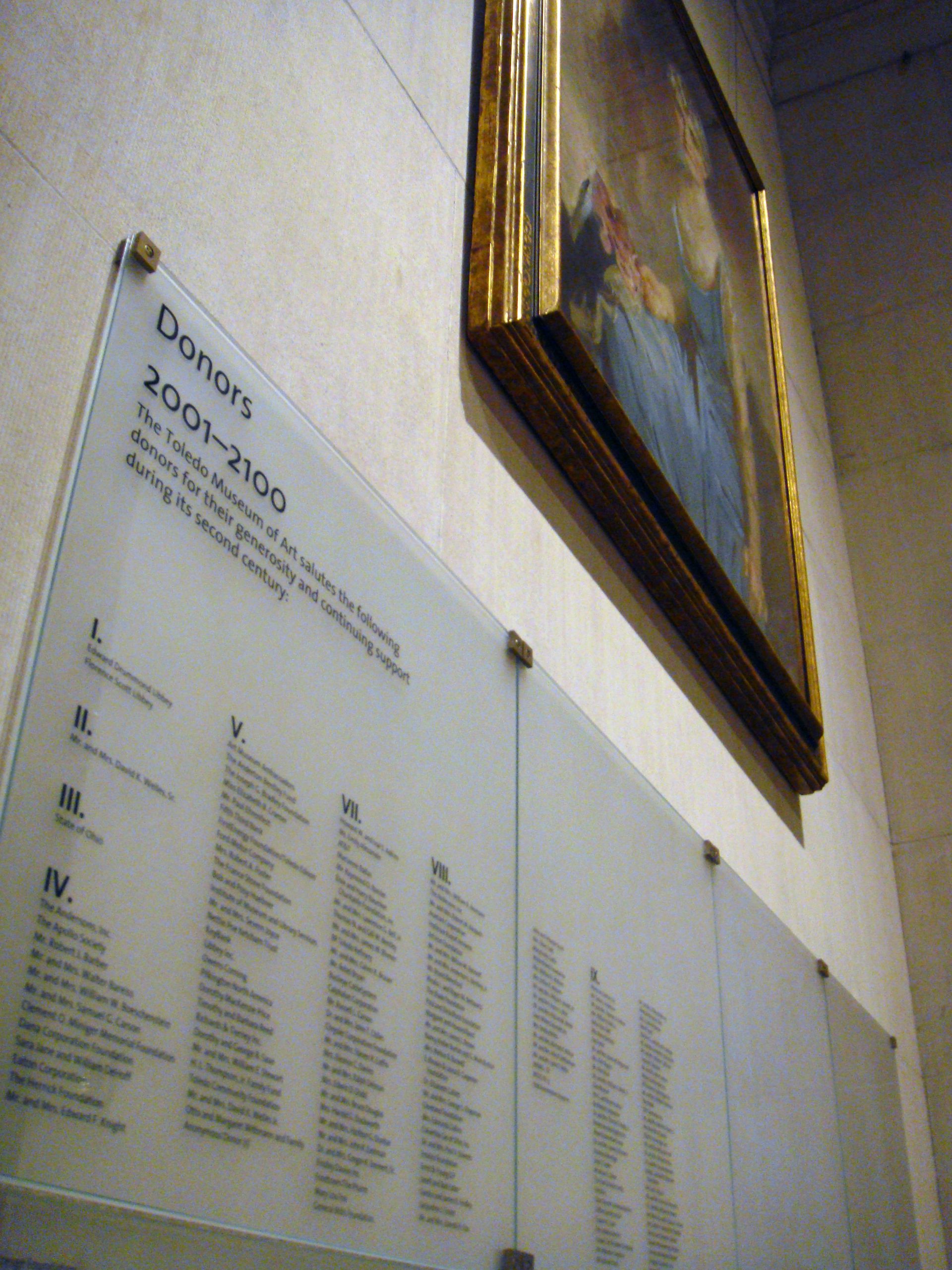 The sign system uses the Museum's "frame" logo to focus attention on landmark historic and contemporary architecture and noteworthy sculpture. Monolithic signs are crafted from leaded steel, used on many of the Museum's buildings, and Libbey Glass, a local company run by the Museum's founder. The sign program was part of a broad initiative to create a new image for the Museum's print and electronic graphics as well as honor past and current donors with a ceremonial donor hall. The exterior sign system is integrated into a campus that features Greek Revival and contemporary architecture by Frank Gehry & Partners and SAANA.